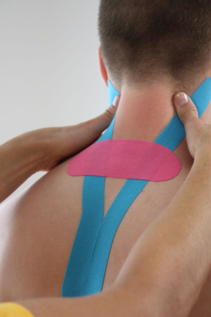 Spezielle Taping-Methode mit elastischen Klebebändern ohne Wirkstoffe. Unterstützt die Muskulatur und fördert den Heilungsprozess.